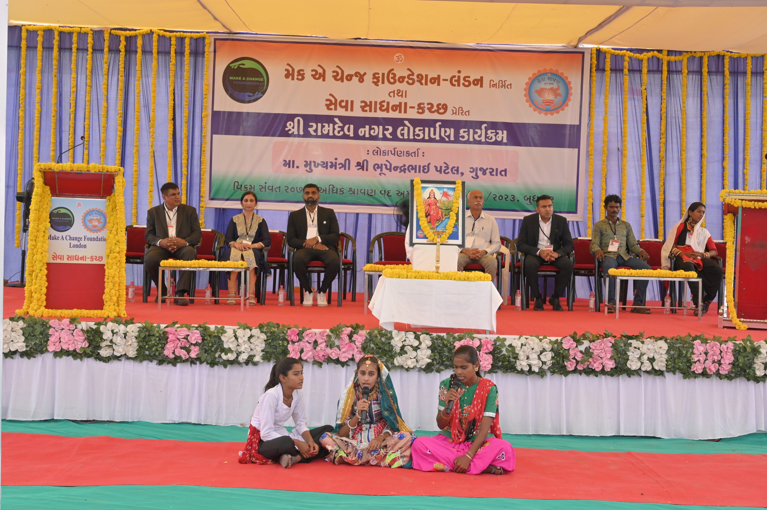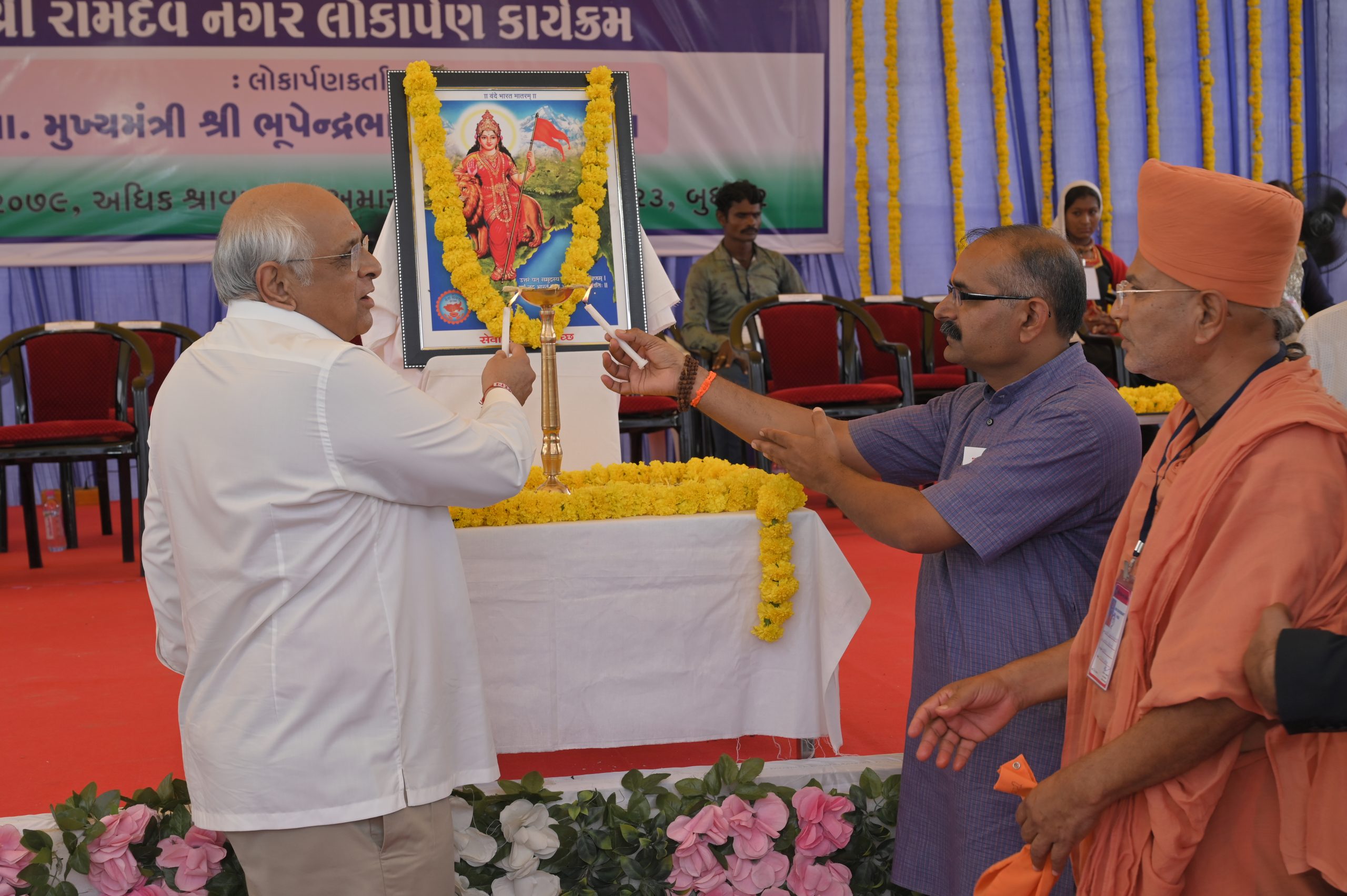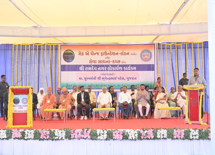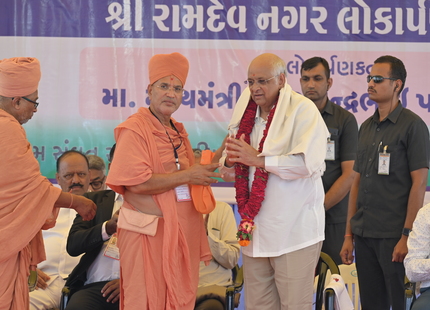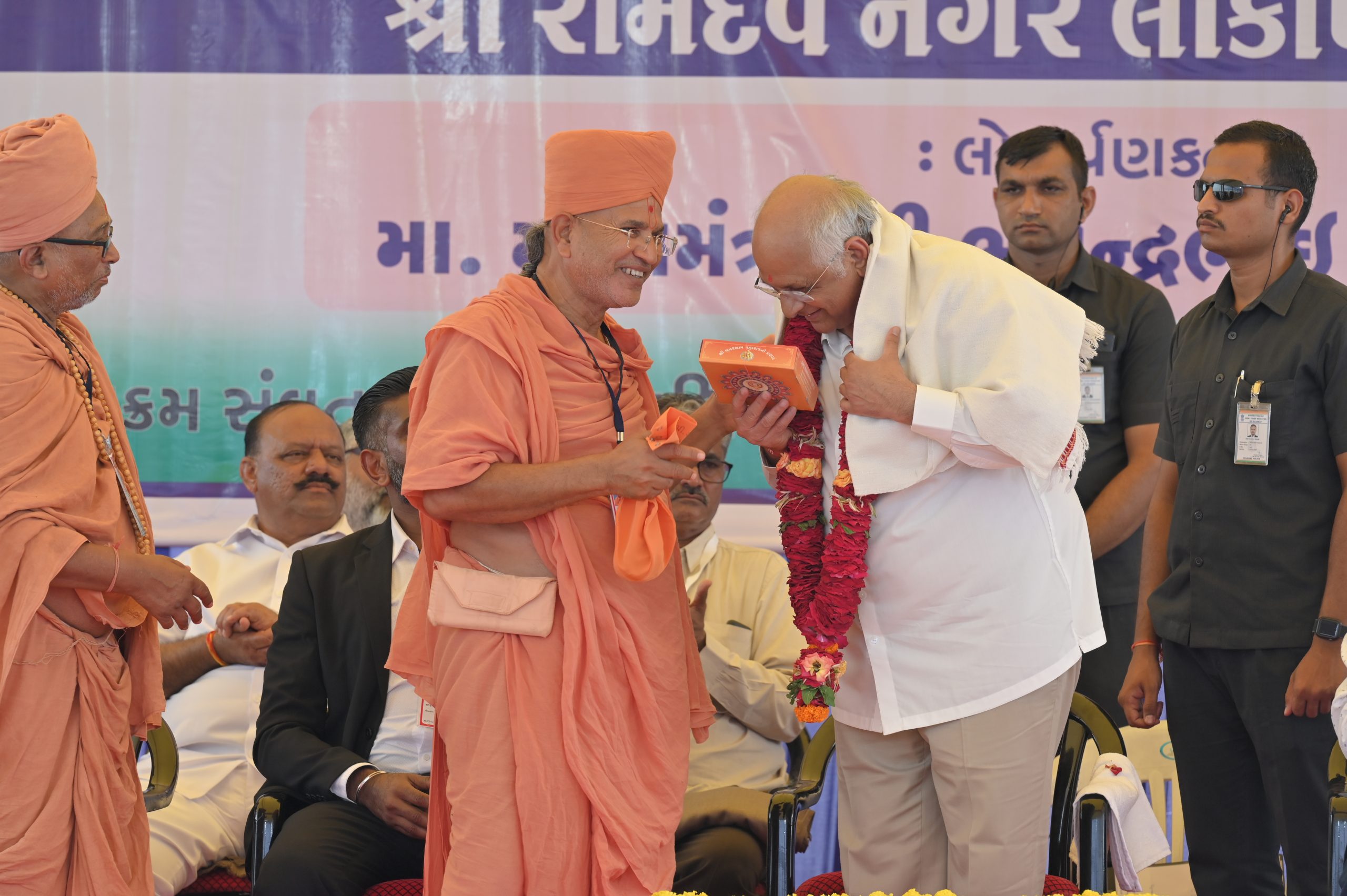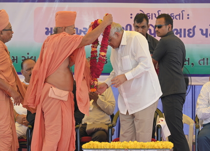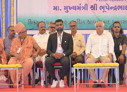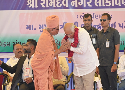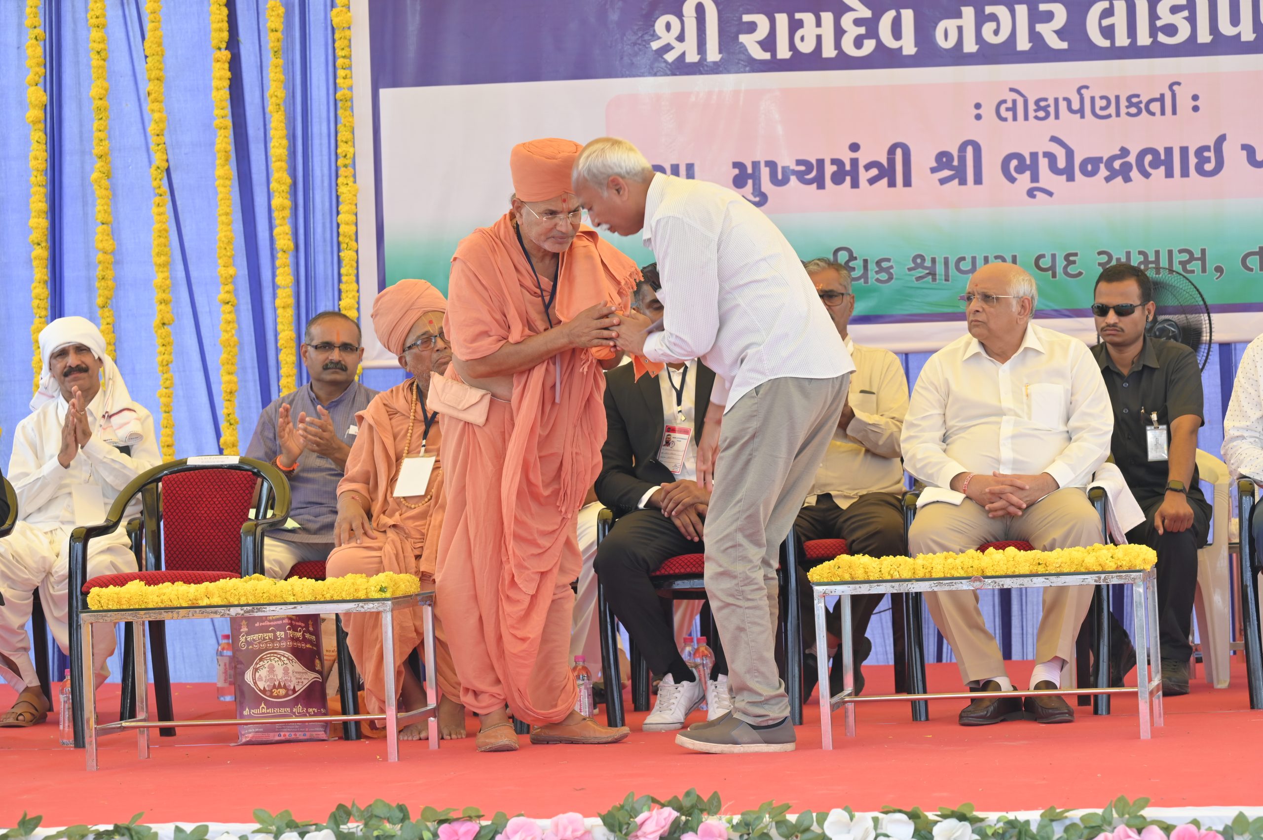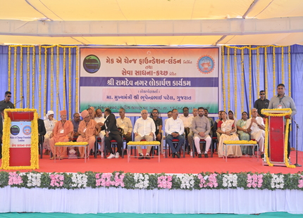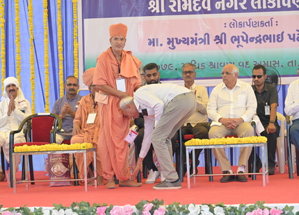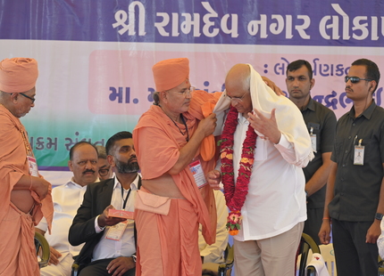 The Chief Minister, alongside the other distinguished guests, including Pujya Sant Shri Balkrishna Dasji and revered saints from Bhuj Mandir, Mrs. Parulben Kara, representing as the Panchayat of Kutch, MLA Shri Keshubhai Patel of the Bhuj Constituency, and Manjulaben Bhanderi, representing the Panchayat of the Taluka district, all added a sense of solemnity and significance to the event.
